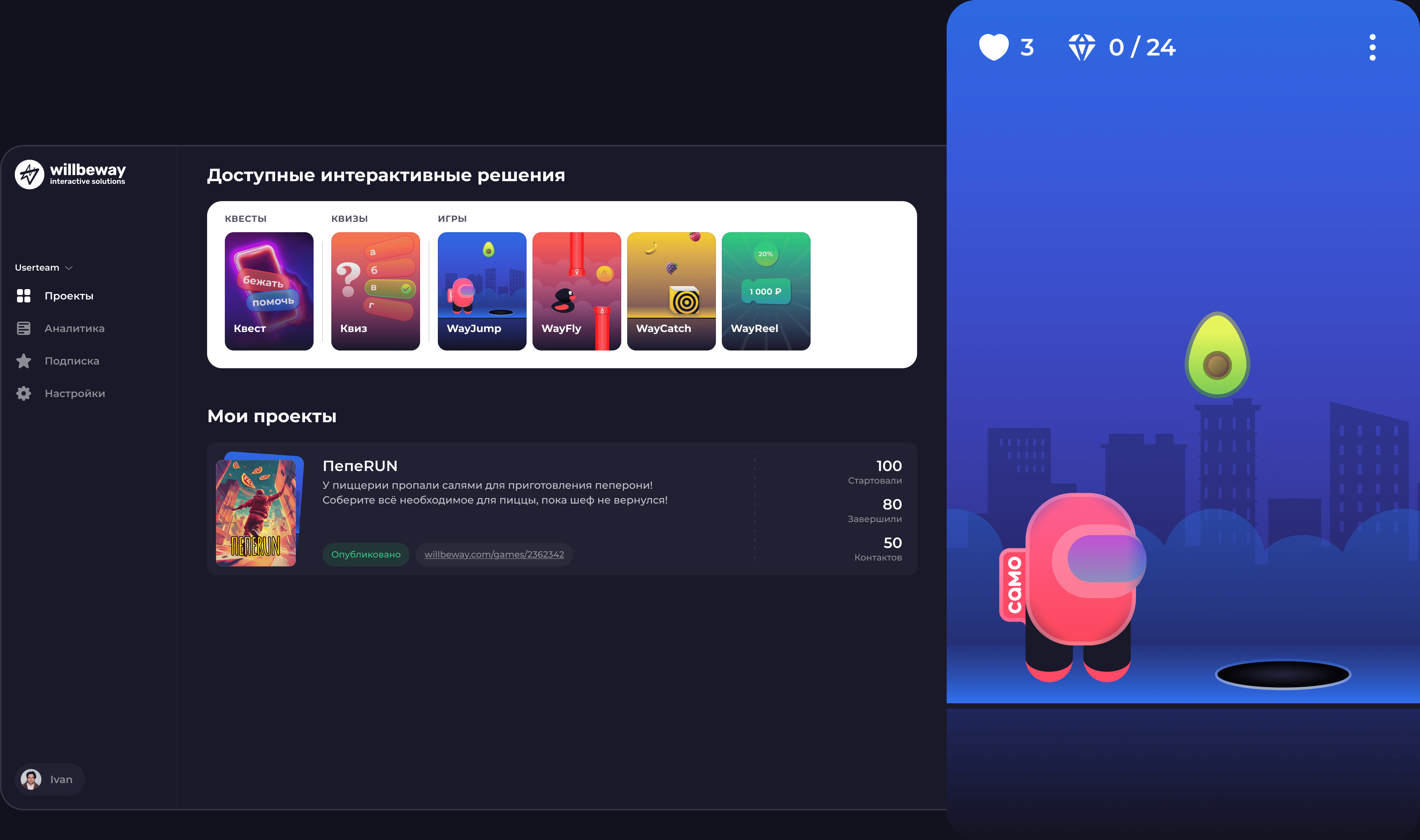Willbeway — это облачное решение. Скачивать ничего не требуется. Ни вам, чтобы запустить проект, ни вашей аудитории, чтобы в нём участвовать.